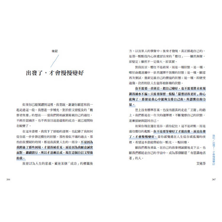 走過跌宕起伏的人生,從谷底一步步靠近嚮往的狀態,艾兒莎想跟大家分享:人生的意義不是藏在某個「成功」的標籤之後,而是在一次次的選擇裡,不斷察覺自己的狀態,逐漸接納和認同自己。我們不需要等到變好了才出發,而是先出發,才能慢慢變好。