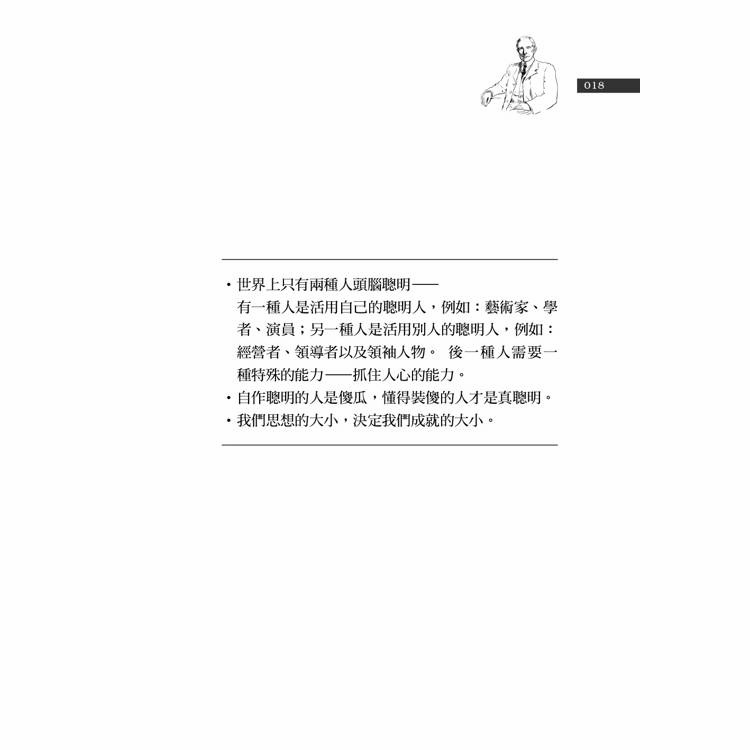 有一種人是活用自己的聰明人,例如:藝術家、學者、演員;另一種人是活用別人的聰明人,例如:經營者、領導者以及領袖人物。 後一種人需要一種特殊的能力—抓住人心的能力。