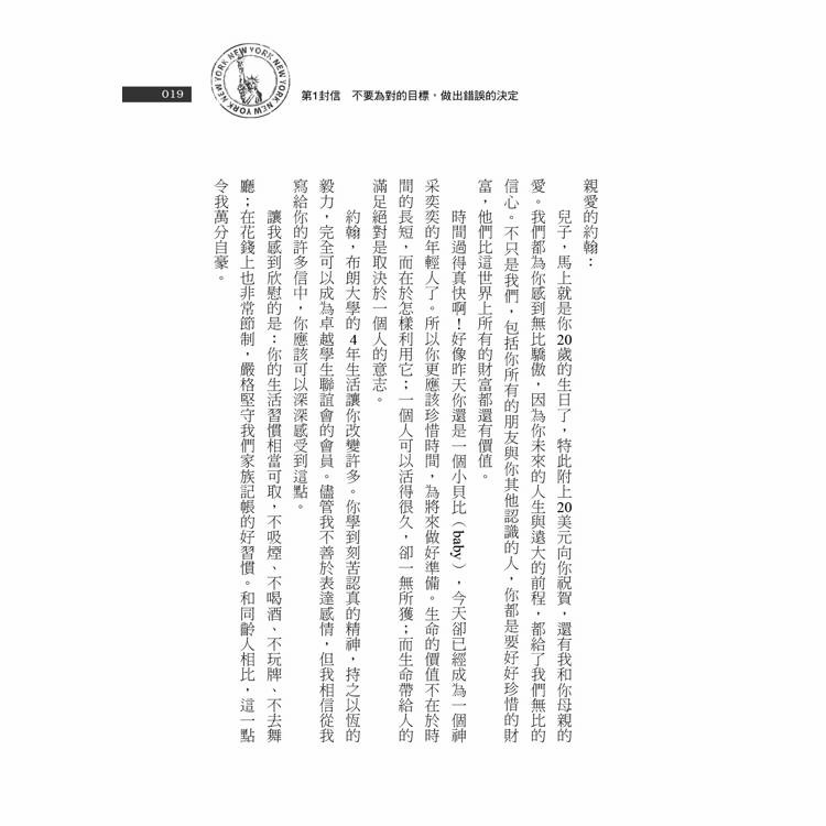 兒子,馬上就是你20歲的生日了,特此附上20美元向你祝賀,還有我和你母親的愛。我們都為你感到無比驕傲,因為你未來的人生與遠大的前程,都給了我們無比的信心。不只是我們,包括你所有的朋友與你其他認識的人,你都是要好好珍惜的財富,他們比這世界上所有的財富都還有價值。