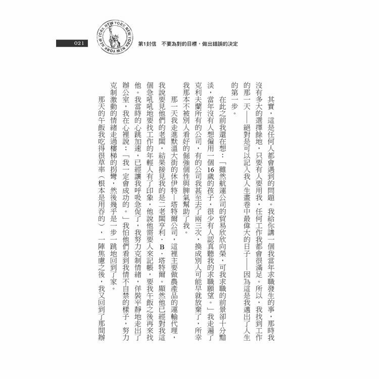 那一天我走進默溫大街的休伊特———塔特爾公司,這裡主要做農產品的運輸代理,我說要見他們的老闆,結果接見我的是二老闆亨利·B·塔特爾。顯然他已經對我這個急吼吼地要找工作的年輕人有了印象,他說他需要人來記帳,要我午飯之後再來找他。我當時的心跳加速,已經讓我呼吸急促了,我努力克制情緒,佯裝平靜地走出了辦公室,我在心裡說:「我一定會成功的。」我怕他們看到我情不自禁的樣子,努力克制激動的情緒走過樓梯的拐彎,然後幾乎是一步一跳地回到了家。