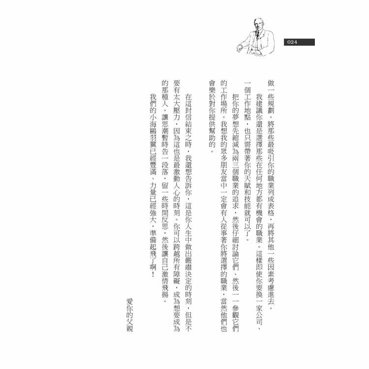 看來,你已經做好了繼承我龐大產業的心理準備。這無疑是最令我感到欣慰的。但你說你現在很苦惱,整天在為從事什麼職業發愁,不知道是否能勝任一個管理者的角色而苦惱。