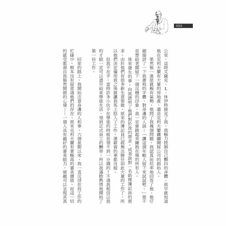 果然他一進屋就極有氣勢,他問了我幾個問題,我認真而坦率地回答了他。他仔細端詳了一下我書寫的字體,對身邊的人說:「讓這個年輕人留下來試試吧。」要不是想給老闆留下一個沉穩的印象,我一定會跳起來擁抱在場的所有人。