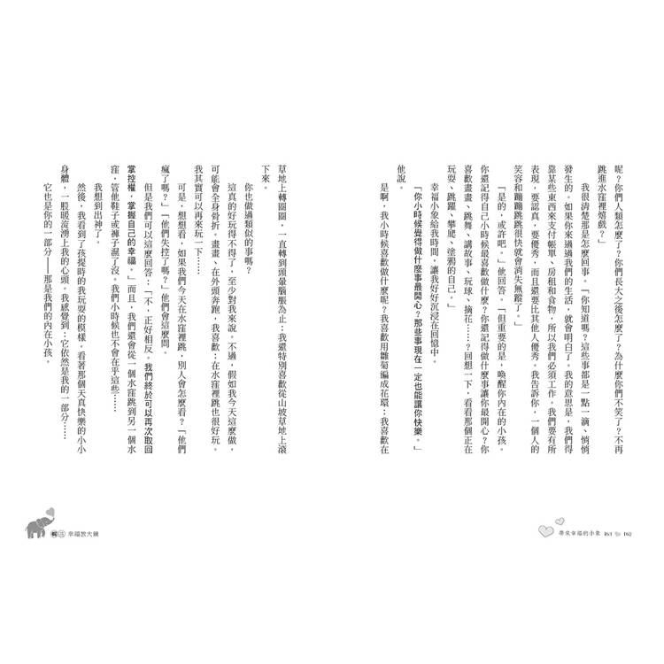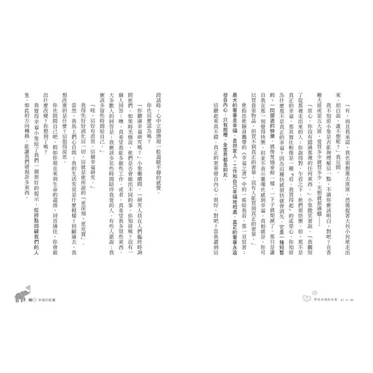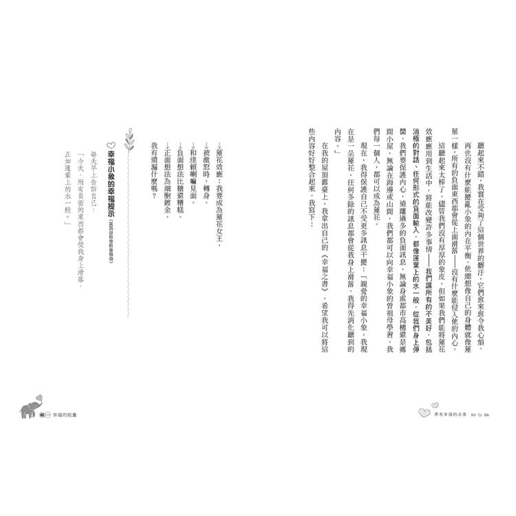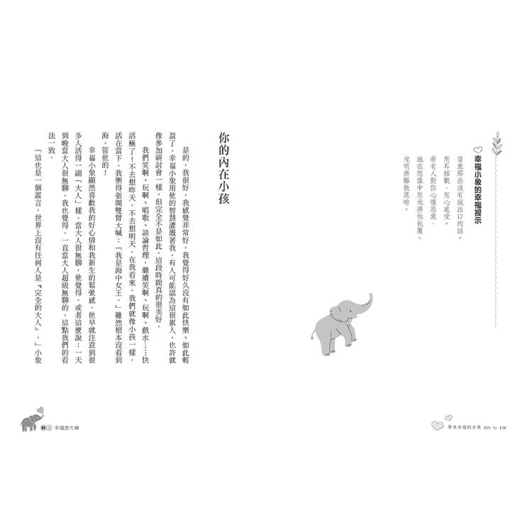 2. 幸福小象的幸福提示:書中每一章結尾都簡明扼要地總結該章節的重點與核心理念,提供具體的引導。
