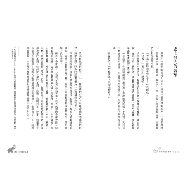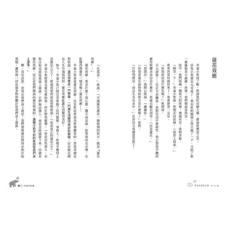 一股幸福的暖流湧遍了我的全身──這隻小象就是載我駛向幸福的渡船。事實上,他也是你的渡船。啊,親愛的幸福小象,真慶幸你找到了我們。