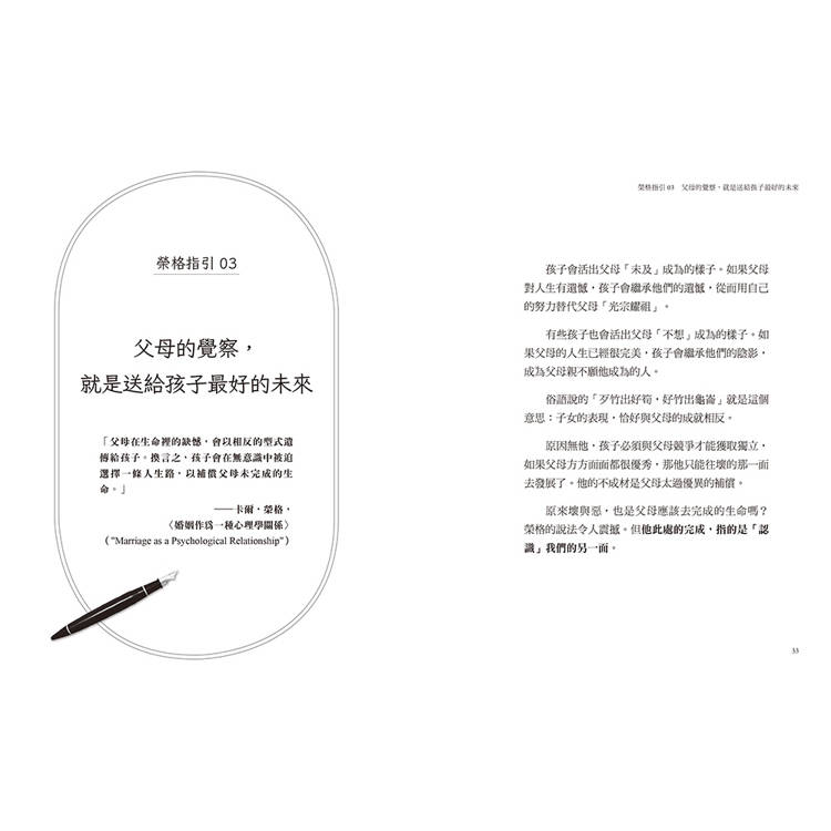 「父母在生命裡的缺憾,會以相反的型式遺傳給孩子。換言之,孩子會在無意識中被迫選擇一條人生路,以補償父母未完成的生命。」──卡爾.榮格,〈婚姻作為一種心理學關係〉("Marriage as a Psychological Relationship")