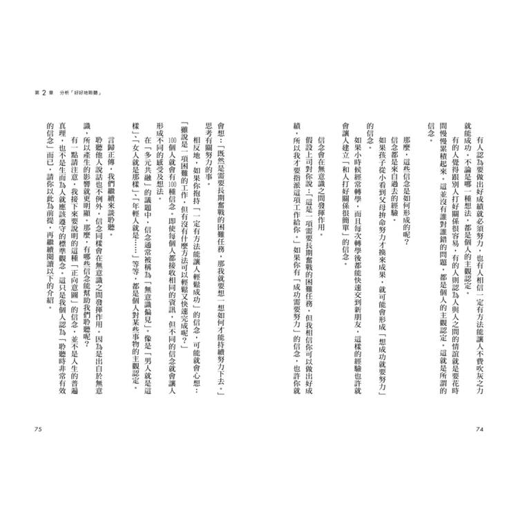 「好好地聆聽」的關鍵不在於做法,而在於態度。只要調整好自己的態度,自然就能「真正地」聆聽別人說話。這個章節會說明這個態度最重要的核心,也就是聆聽所需的有效信念。這是這本書中最重要的部分。