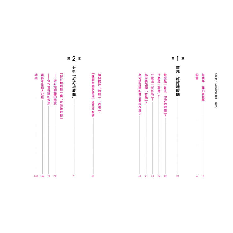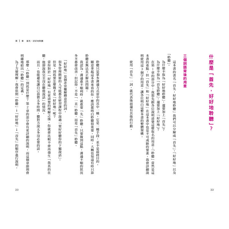 關於第1章,我會說明這本書取名為「首先,好好地聆聽」的用意。我會分別解釋為什麼要強調「先」?「好好地」又是什麼意思?「聆聽」指的是什麼樣的行為?另外,這本書也會談論「表達」。我會在這個章節說明這本關於聆聽的書為何還要特地談論表達,以及介紹聆聽與表達之間的黃金比例。讀完這個章節,各位應該就可以掌握這本書的整體架構。