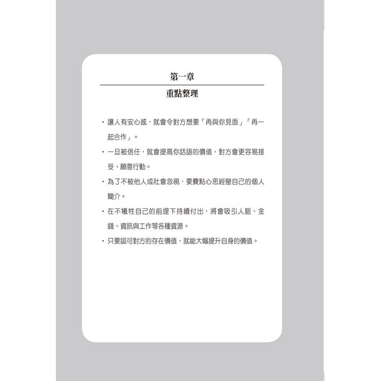 1. 讓人安心的習慣:消除距離感,建立無條件被接受的基礎,讓他人信任你,不被拒絕或疏遠。