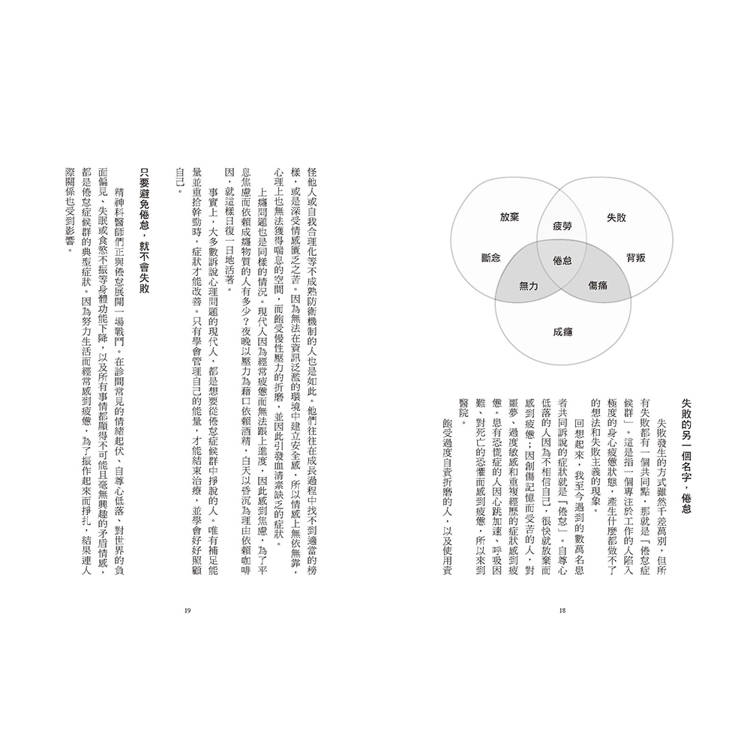 精神科醫師們正與倦怠展開一場戰鬥。在診間常見的情緒起伏、自尊心低落、對世界的負面偏見、失眠或食慾不振等身體功能下降,以及所有事情都顯得不可能且毫無興趣的矛盾情感,都是倦怠症候群的典型症狀。因為努力生活而經常感到疲憊,為了振作起來而掙扎,結果連人際關係也受到影響。