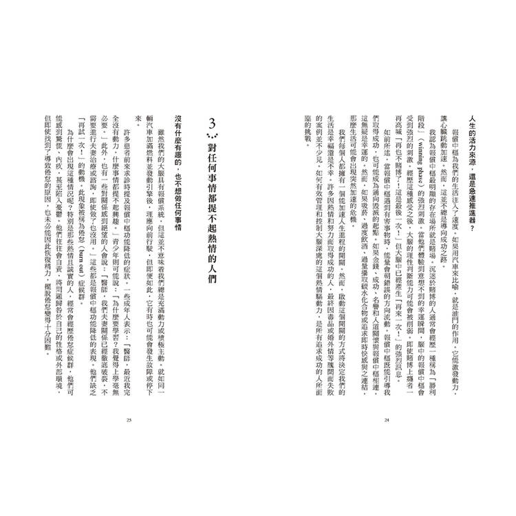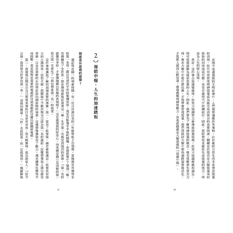然而,這件事必須謹慎處理。如果只強調努力會導致能量枯竭;如果只強調療癒和滿足,則可能被誤解為提倡放棄的人生。因此,我們要先了解精神能量的概念。唯有理解產生意志力時,會在大腦中引起什麼反應,才能學會管理能量。我們將探討大腦中哪些迴路需要被活化,才能使人感到心跳加速,激發挑戰精神與動力。答案就隱藏在大腦深處的「報償中樞」。