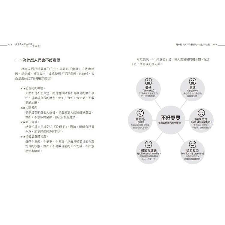 長期壓抑的情緒,終將形成心理地雷。一句「我怕太自私」或「我不想麻煩別人」、「怕被拒絕」成了逃避真實需求的藉口,最後還在不自覺中做出錯誤的選擇,錯失了選擇的權利。但其實,你願意說出來,不是自私,而是負責任地面對自己。要知道,人情世故都藏在我們不好意思揭示以及不願正視的地方,如果撕開社交的偽裝,只看人性的本質,你會赫然發現:那些在關係中真正吃虧的人,總是發生在不好意思開口不好意思拒絕、不好意思爭取的人。