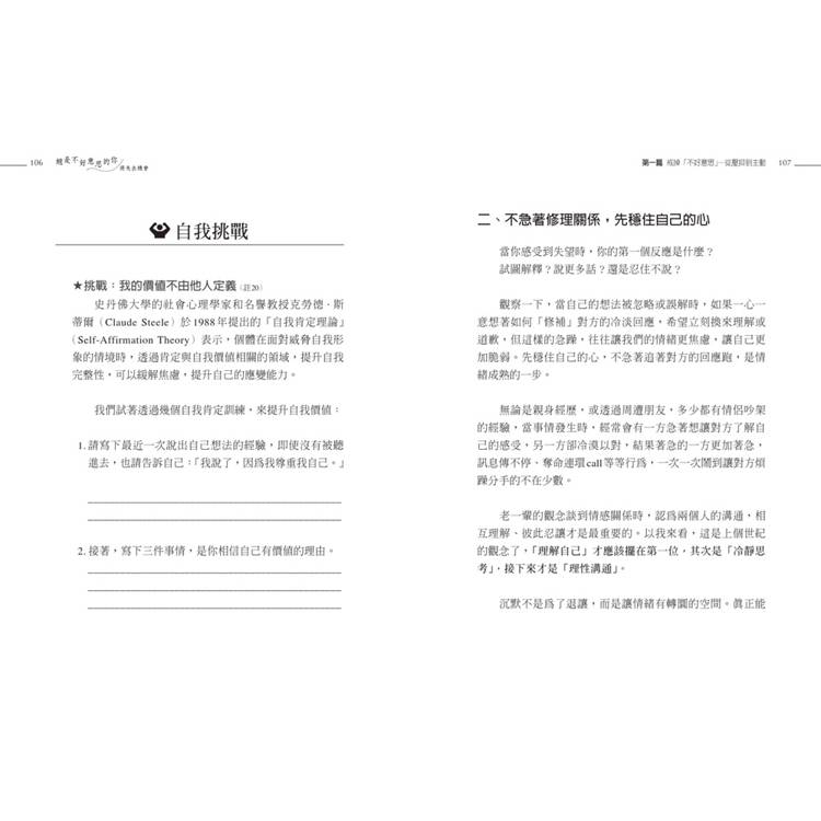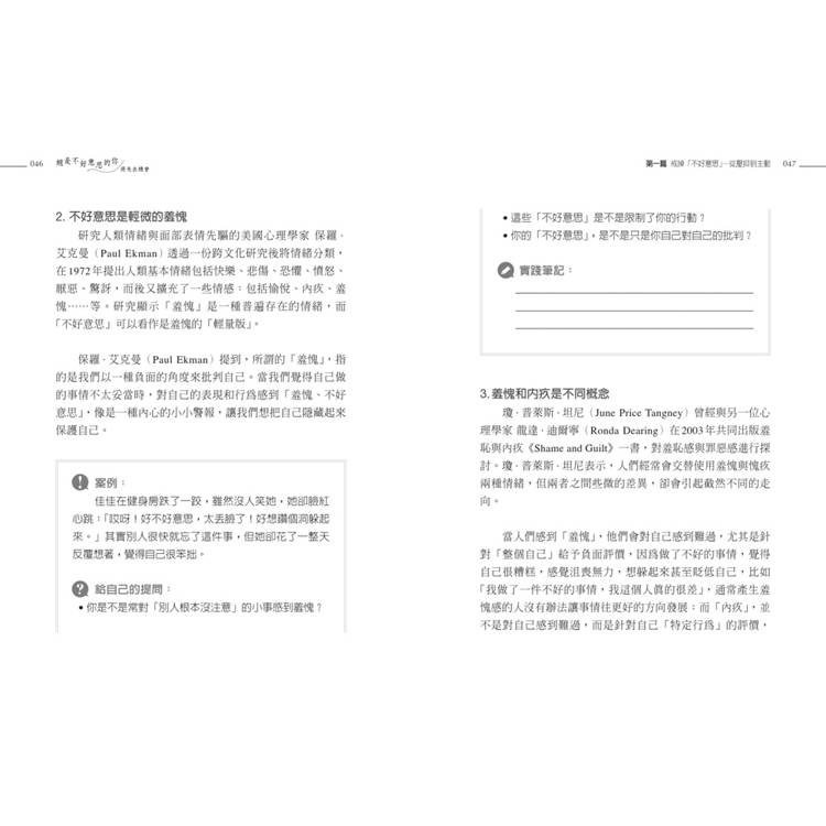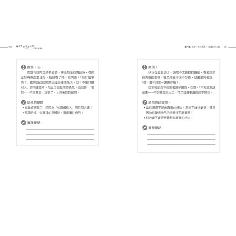 因此,本書希望陪伴讀者,走上一段從「不好意思」到「勇敢開口」的自我轉化旅程。透過自我覺察練習、情緒地圖描繪、行為調整訓練,幫助你逐步建立「說出來」的勇氣與能力。書中也設計了「一句話挑戰」練習,協助你在生活中練習如何說「不」、如何提出需求、如何自信開口。而每一次的實踐筆記,是我特意留下來給讀者們的紀錄空間,請不要忽略作筆記的步驟,這能夠幫助各位在實踐中再次反思,並加深記憶,讓每一個人都能看得到自己的改變。