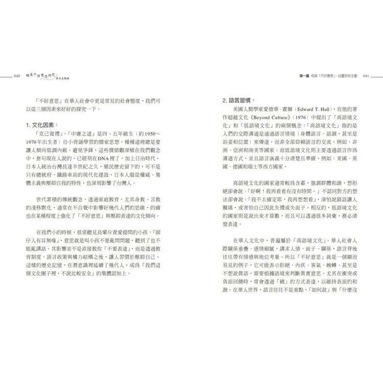 書中不僅探討儒家教條、面子文化、集體主義(註1)與高語境溝通(註2)等深層影響,更深入解析討好型人格、自我否定、自信心不足等心理特質。這些因素,構成了我們在日常對話中退縮、在關鍵時刻無法開口的根源。