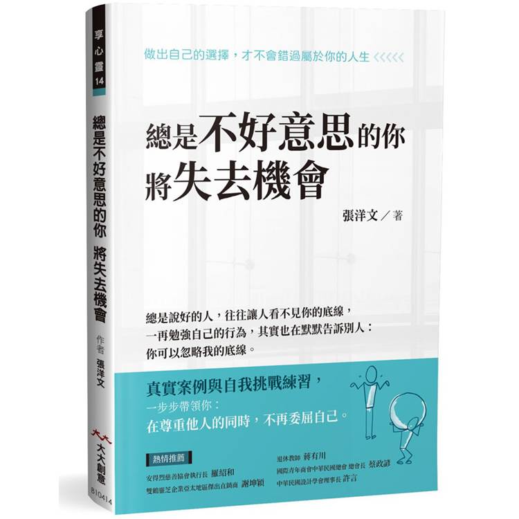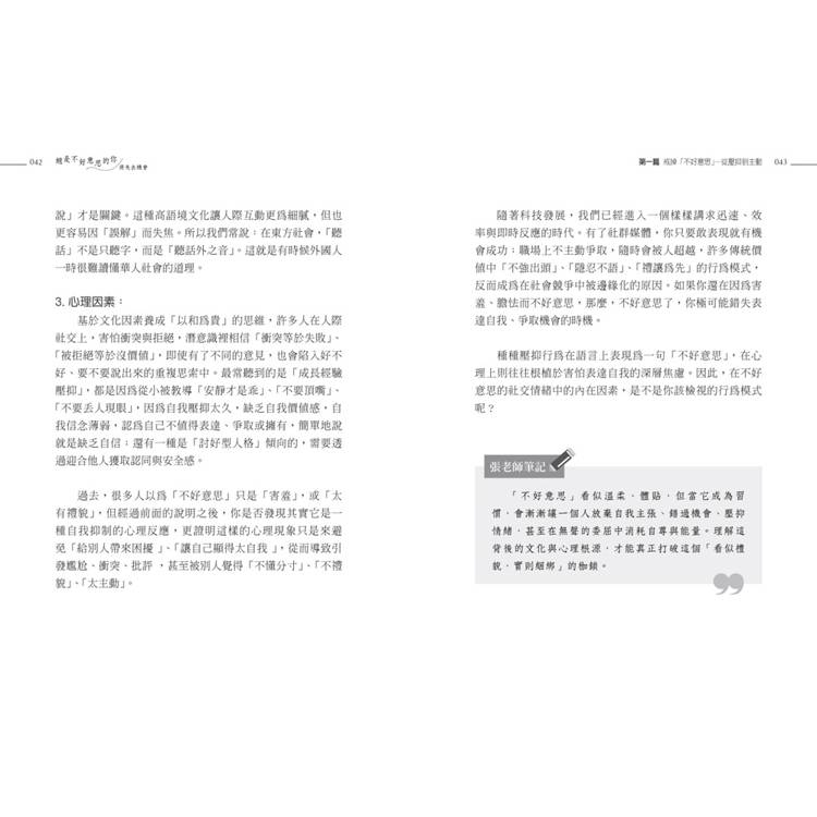 本書《如果不好意思,你將失去機會》,源於我對日常生活中那些「來不及開口」的懊悔與反思。無數人在人生的關鍵時刻選擇沈默,只因為「不好意思」。而這種源自華人文化的沉默價值觀,往往在潛意識裡緊緊限制著我們:害怕被拒絕、害怕被看輕、害怕被討厭,最終,許多可能開啟的機會便在不知不覺間悄然流逝。我相信,這絕不是單一的小毛病,而是許多人成長過程中的集體困境。
