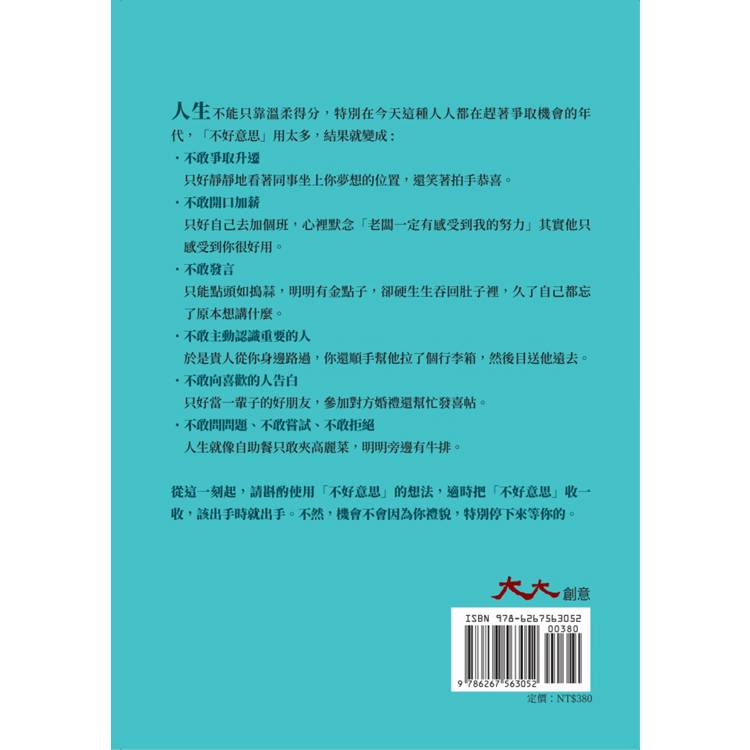 從這一刻起,請斟酌使用「不好意思」的想法,適時把「不好意思」收一收,該出手時就出手。不然,機會不會因為你禮貌,特別停下來等你的。