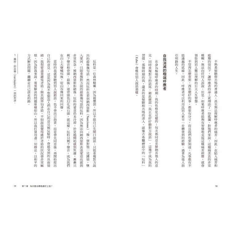 在身為極端呼應者的時期,我的性格是這樣的:每次都同意並接納其他人的意見,同時重複對方的話尾,藉此確認「我正在好好聽對方說話」。這幾乎成為我的習慣。那個時期的我,還真的是傾聽和共鳴的達人。就像古希臘神話中的「厄科」(Echo)會模仿別人說話那樣。