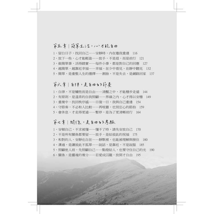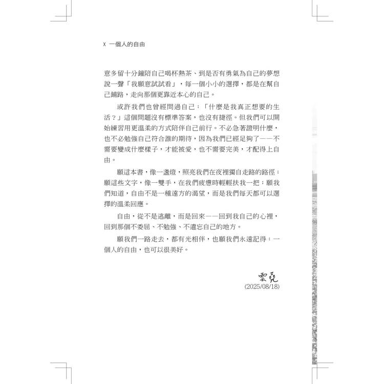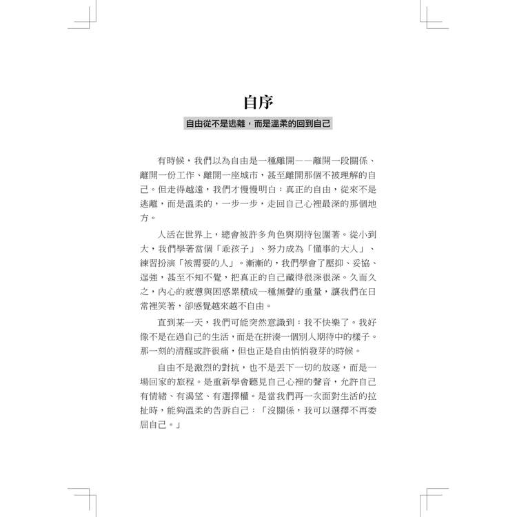 在書中,我不會談理論,也不試圖提供絕對的答案。我只想透過一篇篇溫暖的文字,分享我所理解的自由:它不是一種完美的狀態,而是一種真實的感受;不是一夜之間就能擁有的成果,而是一次又一次對自己誠實、一次又一次選擇善待自己的過程。