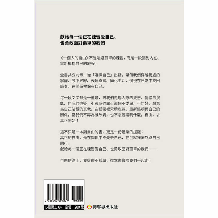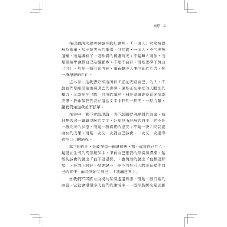 《一個人的自由》並非關於逃避的指南,而是一場深刻的內在探險。作者以細膩的書寫與溫柔的洞察,帶領讀者回到心靈深處,學會在孤獨裡與自己和解,並在日常生活中找到真正的力量與節奏。