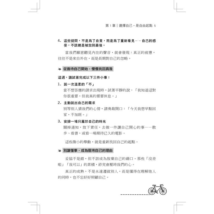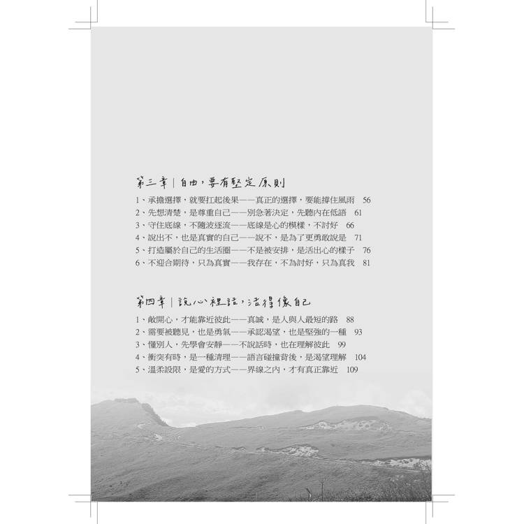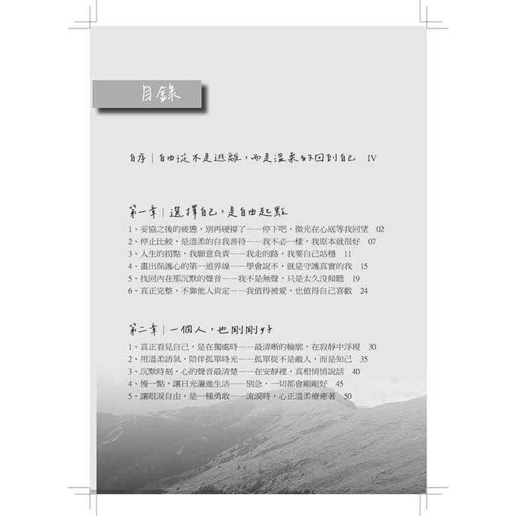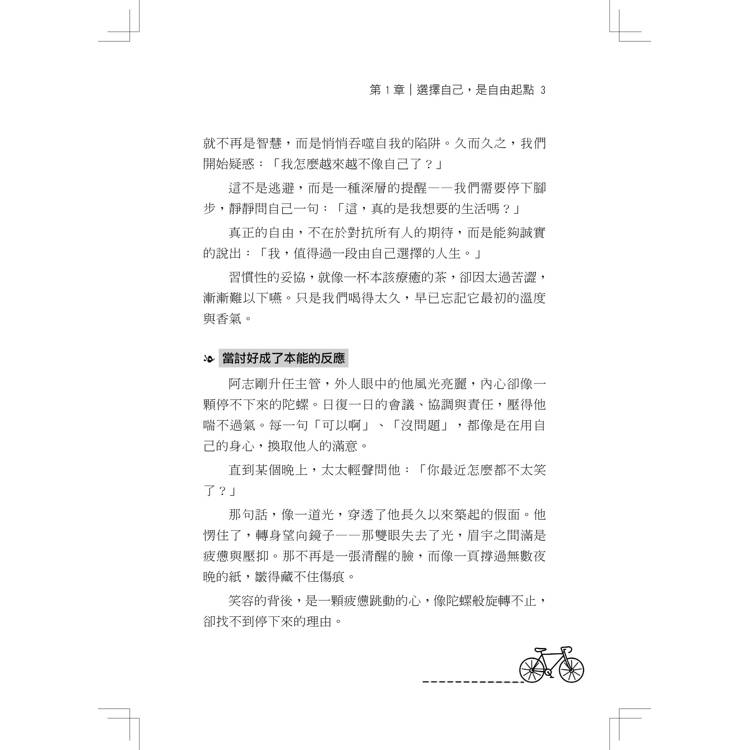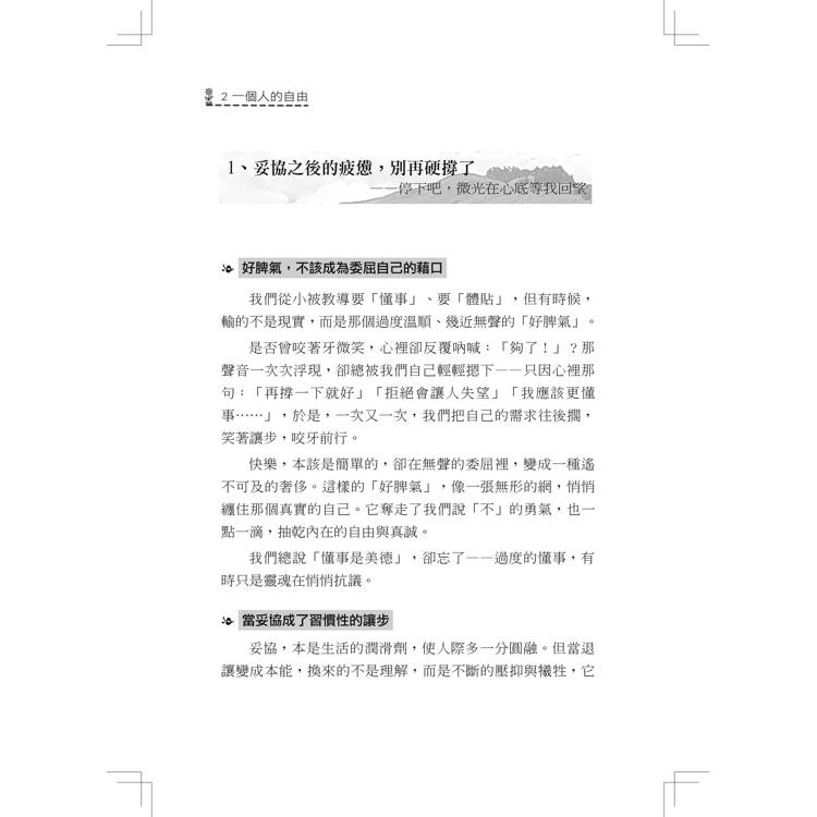全書共分九章,自「選擇自己」出發,逐步引導我們穿越獨處的寧靜、設下健康的界線、勇敢表達真實、簡化過度的羈絆,最終在關係裡仍能保有自我。這是一段從外界喧囂回到內心澄明的旅程,讓人在孤單中累積底氣,在沉默中重建自信。