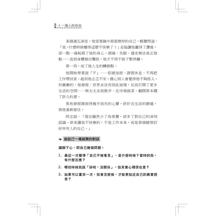 某個週五深夜,他望著鏡中那張憔悴的自己,輕聲問道:「我,什麼時候變得這麼不快樂了?」妥協讓他贏得了讚賞,卻一點一滴耗損了他的身心。頭痛、失眠、週末無法真正放鬆……直到身體發出警訊,他才不得不按下暫停鍵。