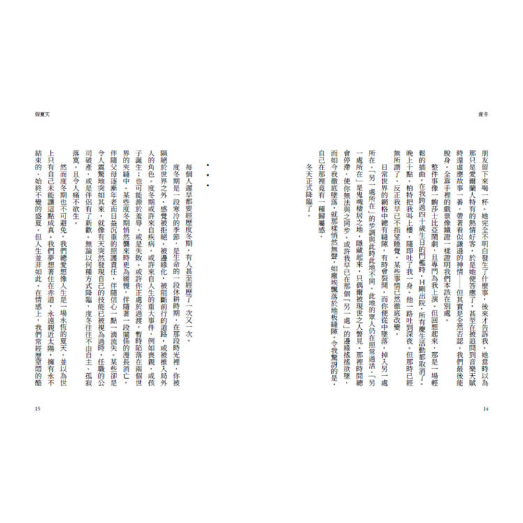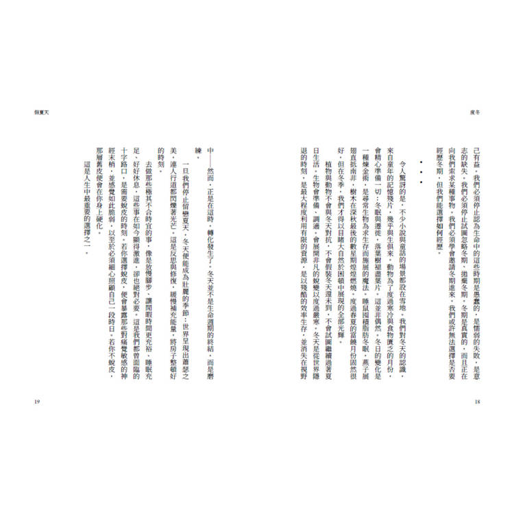 每個人都要學習度冬,像自然界的萬物一樣,在能量變得稀薄的時候,深深縮起來,等陽光再度充沛時,自然而然便能煥發新生。度冬期是一段寒冷的季節,可能來自疾病、喪親、失業、關係崩解,也可能只是一段漫長而難以言說的失落狀態。那是被世界隔絕的時刻,是生命被迫休耕的階段:我們感覺被拒絕、被邊緣化,被阻斷前行的道路,或被推入局外人的角色。個人只能站在邊界,進入一片黑暗而未知的過渡地帶。