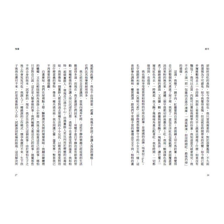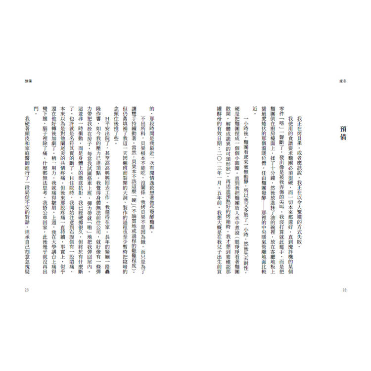 「所有事情」的問題在於,最後看起來就像「什麼也沒有」──只是一陣瘋狂忙亂後的長長陰霾,所有意義都被削去。這幾年就在養小孩、寫書,還有一份經常蔓延到週末的全職工作之間流逝。時間過得如此之快,快到我都說不上是怎麼過去的。那幾年雖不至於空白,但確實是一片模糊,除了那股掙扎求生的感覺之外,奇異地缺乏意義。我把那罐酵母拿在手裡,翻過來又翻過去,努力建構某種關於自己的敘事,好讓我明白自己是如何從那裡走到這裡。我覺得自己彷彿掉進一口深長無比的電梯井,直到如今才砰一聲重重落了地。這裡很空曠,回音不斷,而我還不確定如何出去。我正在試著找回一些我認得的東西。