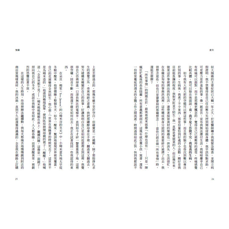 我累了,這是一定的。但事情不止於此。我像是被掏空了。我變得煩躁易怒,總覺得自己像被獵捕的獵物,認為每件事都很緊急,自己做的永遠不夠。而我的家,我心愛的家,也陷入一種熵變:每件東西都在緩慢塌陷、崩解、磨損,碎屑堆積在每個表面與角落,而我面對這些,束手無策。
