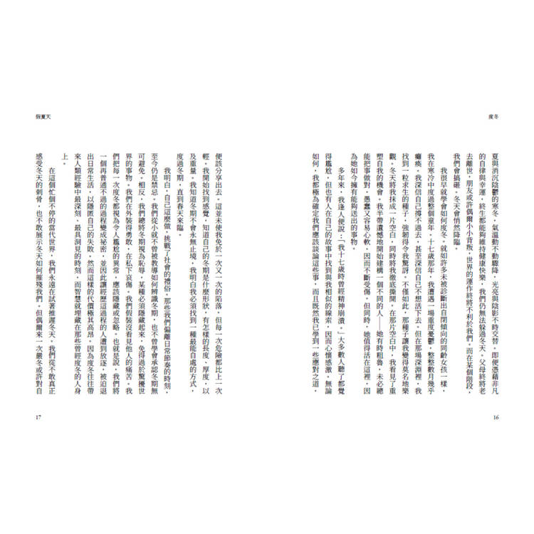 《度冬》是一部緩慢的生活探索札記。凱瑟琳‧梅以一種近乎世俗神祕主義的聲音提醒我們,冬天並非生命的盡頭,而是循環的一部分。而低潮、失落與黑暗,不需要被立即走出,而是需要被理解、聆聽,甚至珍惜。度冬是在黑暗中學習等待,是允許自己以尚未成形的樣子靜靜蟄伏。