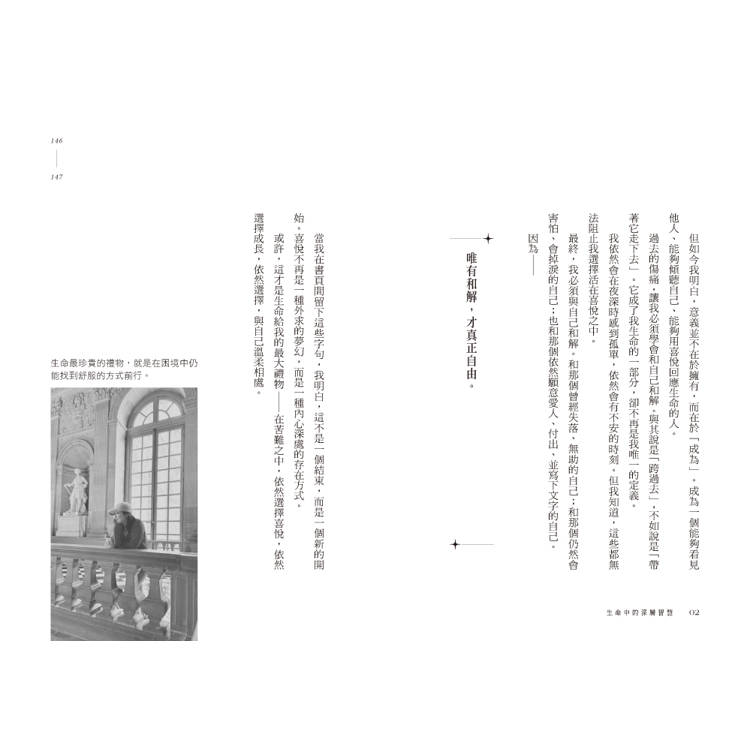 透過她的文字,讀者能看見她如何在挑戰中保持優雅,如何在逆境裡找到力量,也能汲取她那份不畏困境、勇於突破的精神。