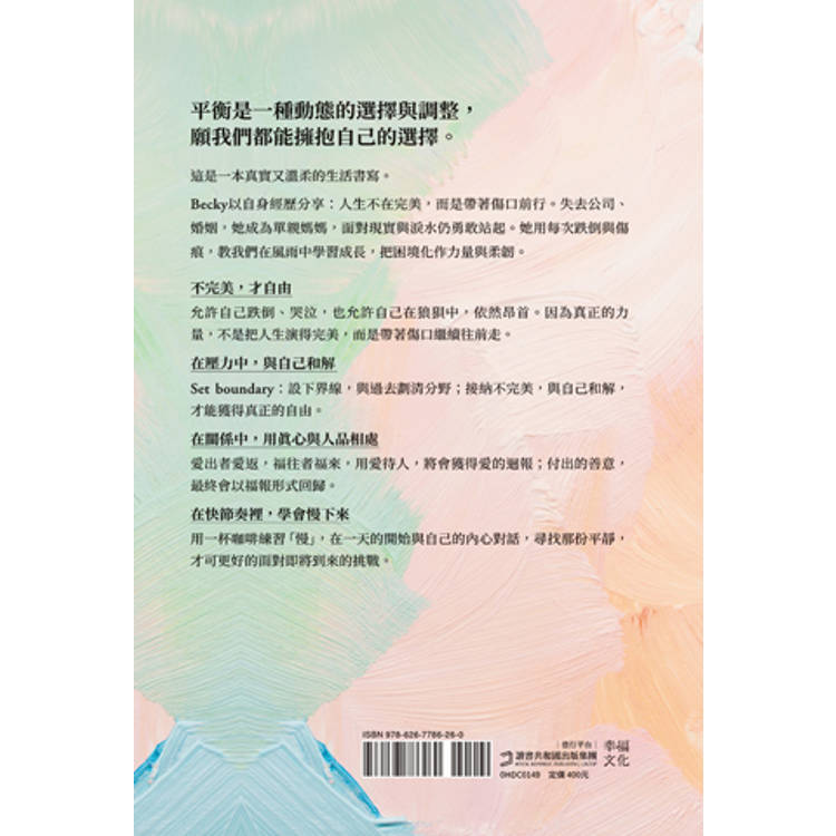 Becky以自身經歷告訴我們:力量,不在於把人生演得完美,而是帶著傷口繼續前行。從關係裡的真心,到行動翻盤的勇氣;從壓力中的智慧,到慢生活的安定,她以柔美卻堅定的姿態,寫出屬於每個人都能實踐的翻盤心法。
