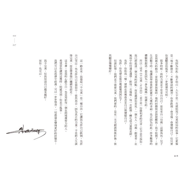 所以,這本《不完美,才自由》,並不是一份勝利者的宣言。它不是告訴你, 我已經抵達一個完美的終點,而是邀請你看見:一個女人、母親、創業者,在風雨中如何邊走邊學,把每一次傷痕、每一次跌倒,轉化成力量與柔韌。