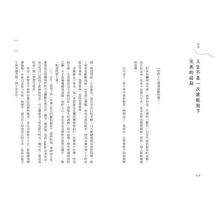 二○一五年,我寫下第一本書《我在巴黎租個家》。那時的我,單純而天真, 覺得能在異鄉用新的方式體驗在地生活,便是一種浪漫。當時 Airbnb 尚未普及, 我以為自己找到了新鮮的角度,可以讓更多人看見旅行的另一種可能。那是我的第一個「夢想完成品」。