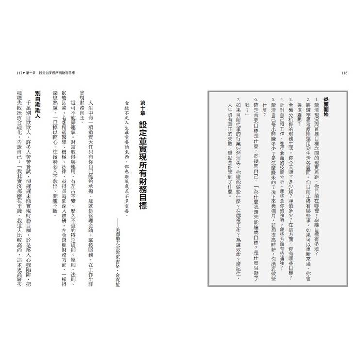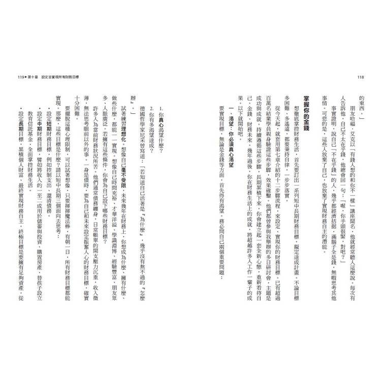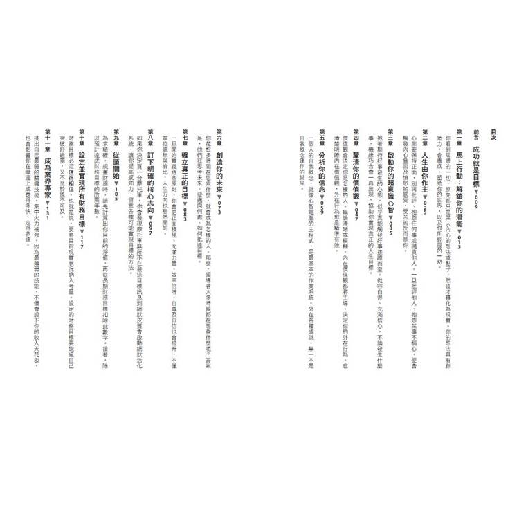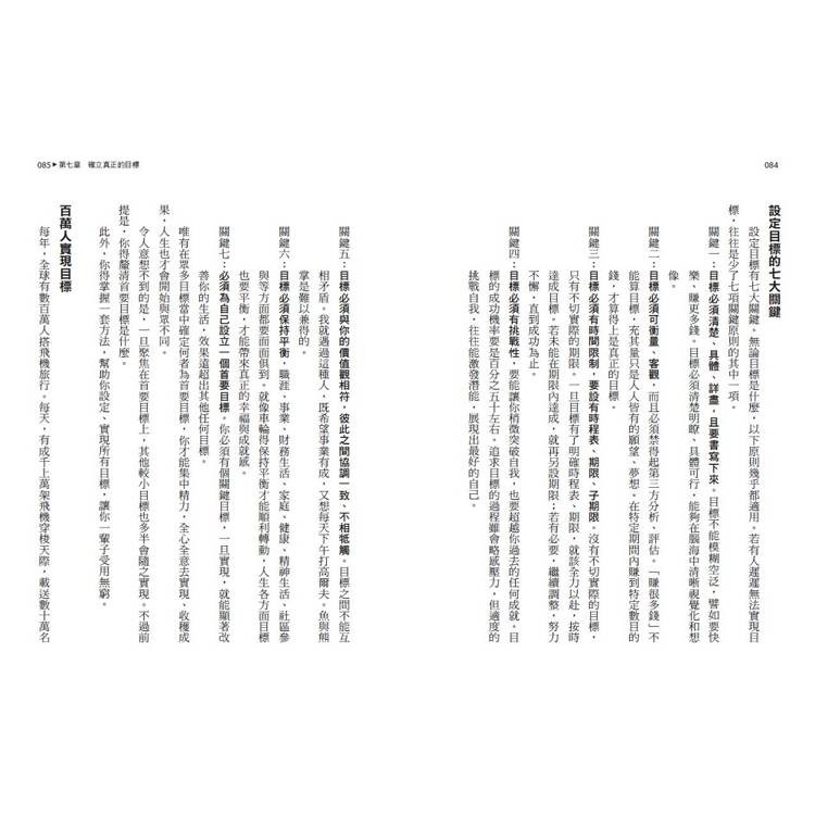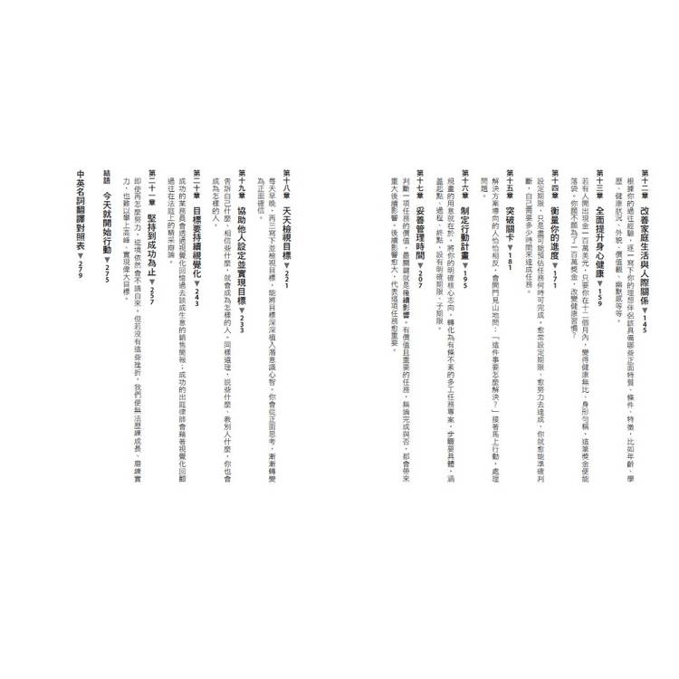 書中也例舉了人生中最重要的各種目標,例如職業、財務、健康、家庭、人際關係等等,教你隨時檢視自己的進度,如何一步一步實現它們。
