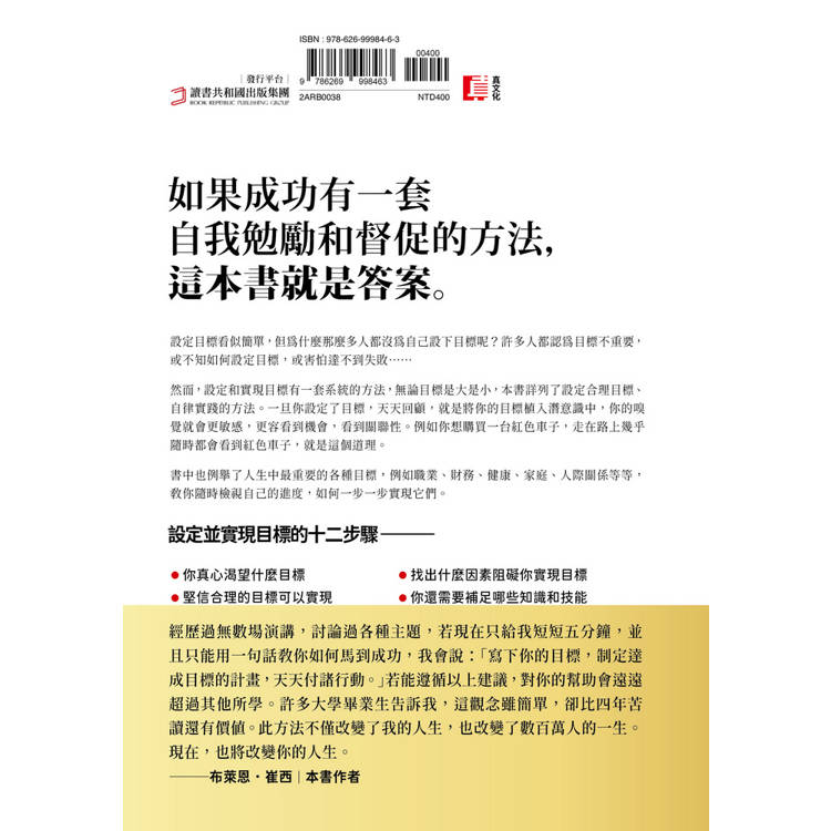 本書的方法已協助百萬讀者成功實現他們的目標!無論目標大小,作者將這套改變了百萬人的方法,透過本書改變你的人生。