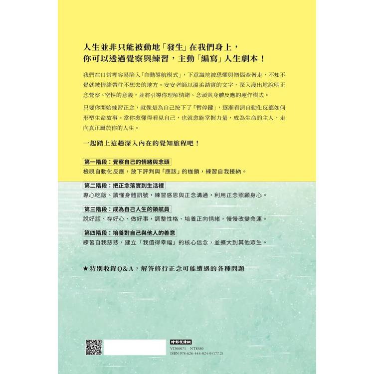只要你開始練習正念,就像是為自己按下了「暫停鍵」,逐漸看清自動化反應如何形塑生命故事。當你愈懂得看見自己,也就愈能掌握力量,成為生命的主人,走向真正屬於你的人生。