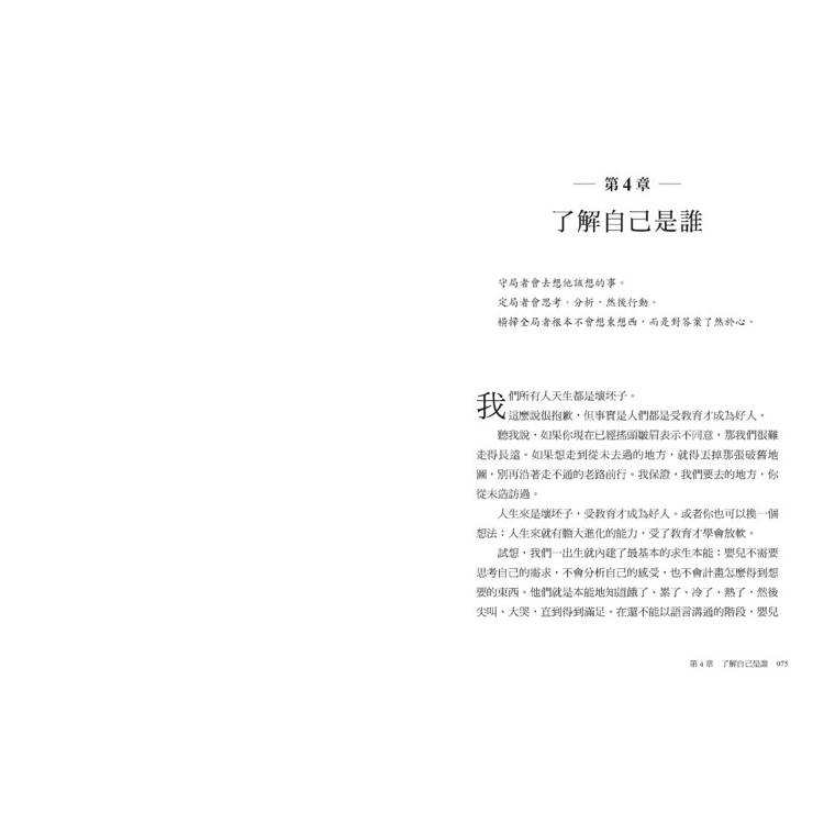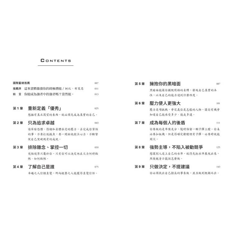 為了幫助各位達到這一點,我會探討一些挑戰性很高,甚至可能讓你感到不舒服的話題。如果這讓你不自在,我不會為此道歉。成功的關鍵在於面對現實,直面心魔,而非強顏歡笑。如果你需要的是別人拍拍你的背,稱讚一聲「做得好」,那麼這本書並不適合你。畢竟,想所向披靡的話,就得正視自己的潛能,使其成為助力。