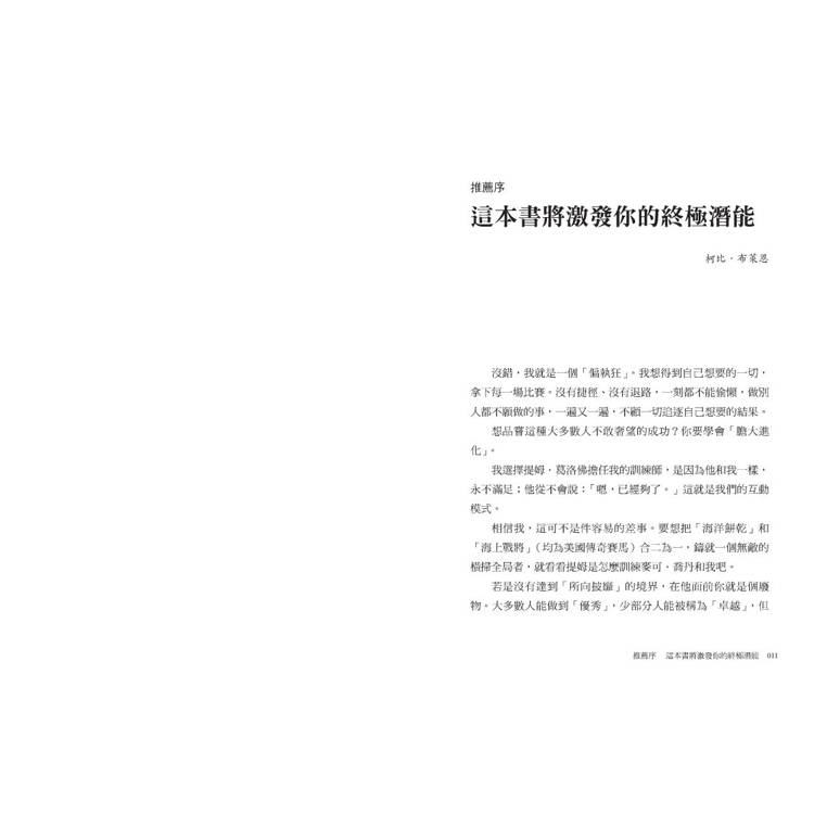 本書的內容旨在提升各位對於卓越的標準。正如柯比說想奪下六枚總冠軍戒指,我就要他奪下七枚;有人和我說想在十週內養好傷,我就會讓他的傷勢在八週內復原;你想減重14公斤,我就讓你減去15公斤。