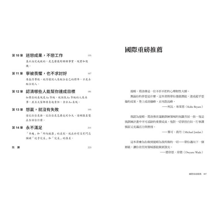 「提姆.葛洛佛終於帶領讀者走進幕後,揭開他與喬丹、柯比多年合作的祕密。這本引人入勝的著作,在揭示那些巨星訓練哲學的同時,也讓我們看到這些原則如何應用於每個人身上⋯⋯精彩絕倫。」