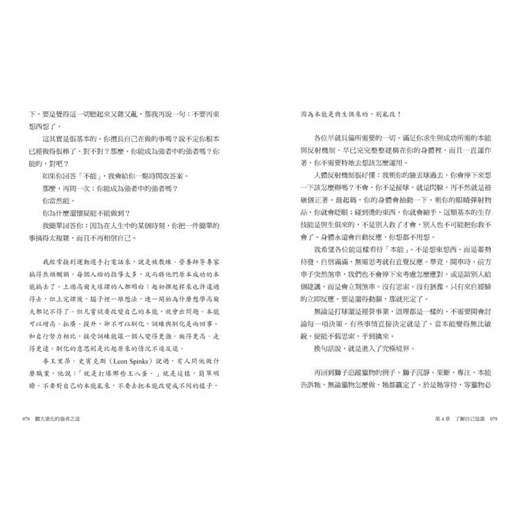 「忘記輸球這回事。」我一邊說,一邊看他是否眼睛一亮,這便表示他心領神會了。「也別想著要盡力而為就好,因為只是盡力而為的話,仍可能會失敗。你想成為頂尖人才是嗎?那就得無視痛苦與疲憊,不要有壓力地想去討好所有人;別讓敵人奪走你的膽識、在你的腦海中盤據不去。即便外界天翻地覆,你也要不為所動。你的內心十分平靜,原因在於你訓練有素、有備而來,是這個領域的頂尖人才。不用告訴任何人你打算怎麼處理局面,你只需要相信自己並直接行動。其他人都驚慌失措、喘不過氣,而你只要一句:『交給我。』就能掌握全場,你出手毫不手軟,然後結束這場戰鬥。」