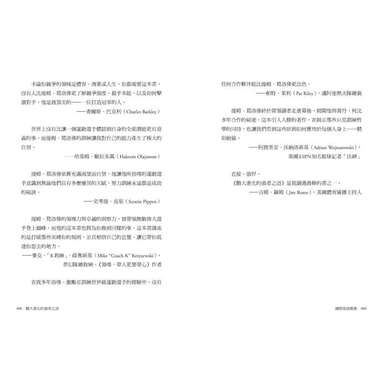 「不論你競爭的領域是體育、商業或人生,你都需要這本書。沒有人比提姆.葛洛佛更了解競爭強度、殺手本能,以及如何擊潰對手。他是最頂尖的——一位打造冠軍的人。」