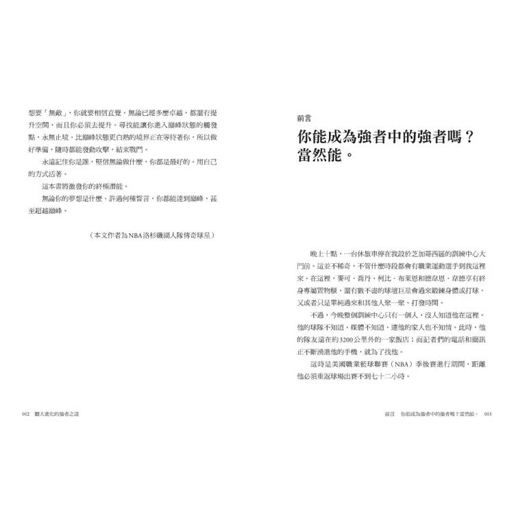 在以下篇章,我會暢談我和麥可.喬丹、柯比.布萊恩和德韋恩.韋德等籃球明星及體壇內外許多成功人士的互動故事。然而這本書並不是一本在教怎麼打籃球的書,我也不是要教你成為下一個喬丹。因為沒有人能成為下一個喬丹,對此最有切身體會的正是柯比和韋德。如果要問這輩子有沒有可能籃球打得和他們一樣好,這個答案多半是否定的;但是,有沒有可能學習他們的敬業精神、所向披靡的幹勁和對目標毫不妥協的專注?那絕對是辦得到的。