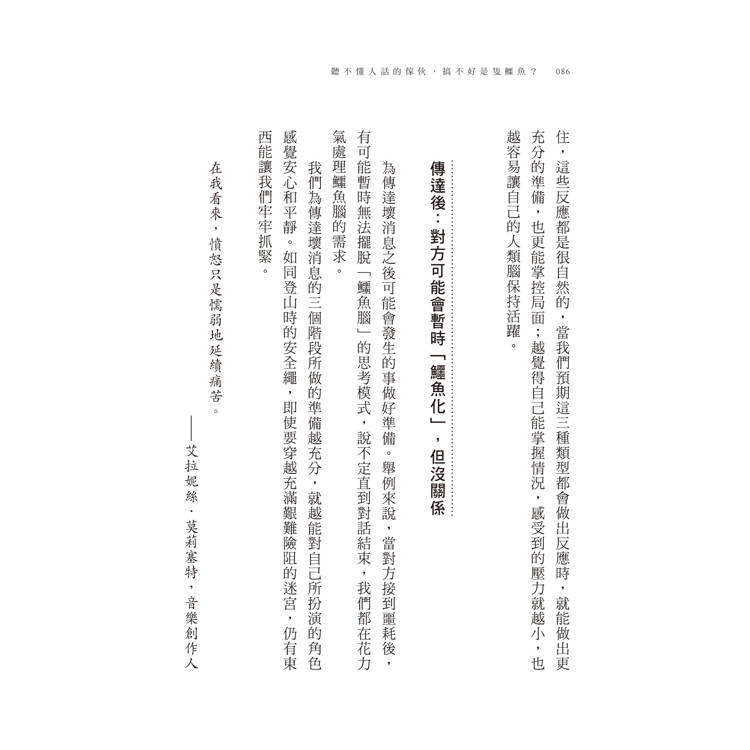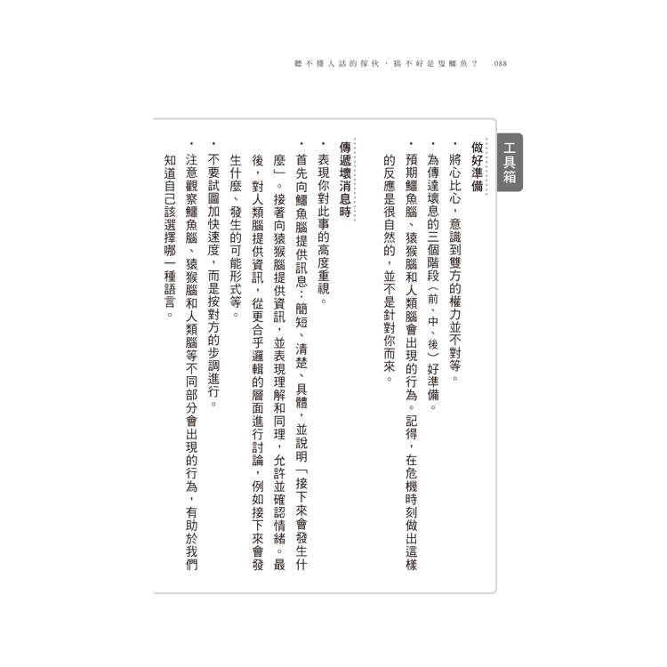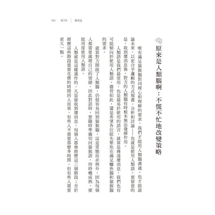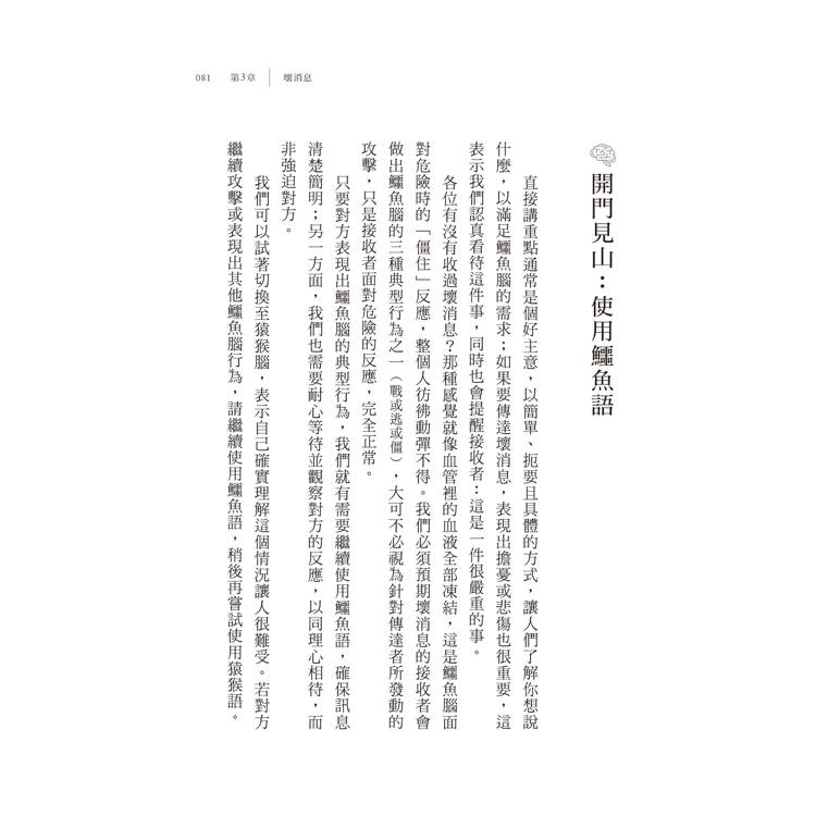 與他人互動時,只要與大腦裡正在發生的事情相互配合,不但能讓我們避免陷入語言陷阱,也能讓我們獲得一條保命的安全繩。我們可以把這些知識運用在所有人際關係中,尤其是充滿挑戰的關係,或是當我們感到壓力與恐懼時。