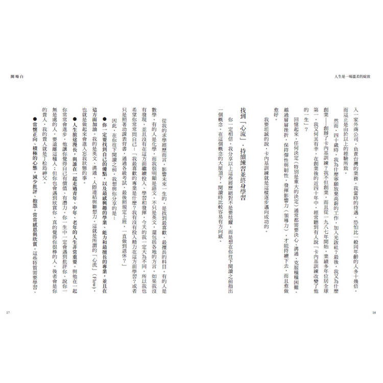 ● 你一定要找到自己的優點,以及最感興趣的學業、能力和最擅長的專業,並且在這方面加油。我的是英文、溝通、人際連結與聯想力。這就是所謂的「心流」(Flow),也就是做起來會進入忘我狀態的事。