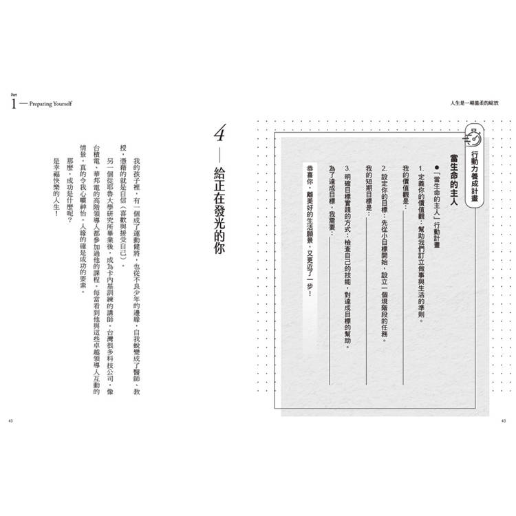 ◎ 行動力養成計畫:特別設計延伸練習,讀者可以跟著每項行動做練習,用心思考、重新審視,一步步實踐「成就更好的自己」。