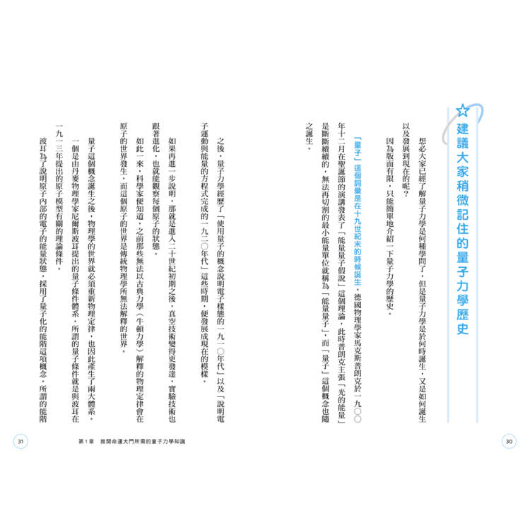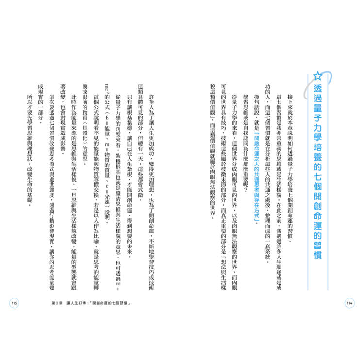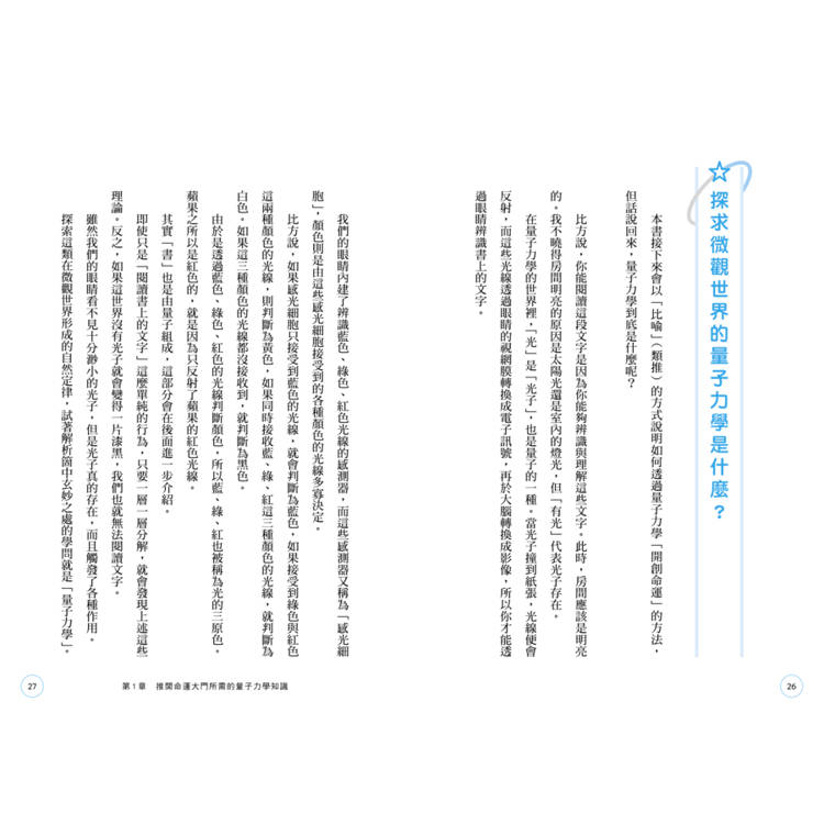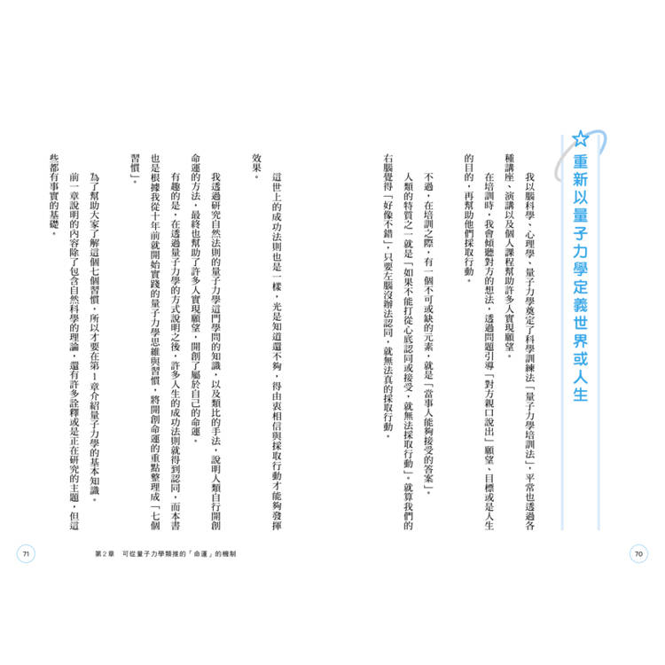 除了淺顯易懂地說明量子力學的世界之外,還介紹以類比手法開啟命運大門的祕訣與習慣。具體來說,本書分成三大章。