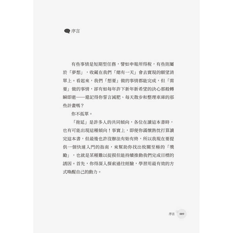 「拖延」是許多人的共同傾向,各位在讀這本書時,也有可能出現這種傾向!事實上,即便你滿懷熱忱打算讀完這本書,但最後也許沒辦法有始有終,所以我現在要提供一個快速入門的指南,來幫助你找出攸關至極的「獎勵」,也就是某種難以捉摸但能持續推動我們完成目標的誘因。首先,你得深入探索過往經驗,學習用最有效的方式喚醒自己的動力。