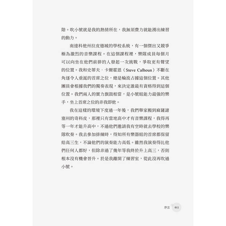 香檳音樂大王勞倫斯‧韋克(Lawrence Welk)及搖滾青年偶像鮑比‧維(Bobby Vee)皆發跡於南北達科他州,由此可見,為何我所就讀的南達科他州中學音樂如此盛行,我也浸淫其中。無論是行進樂隊、爵士樂隊還是管弦樂團,你都能看到我用小號吹奏優美旋律的身影。我的課業成績慘不忍睹,因為那些學科對我來說乏味至極,我寧可鑽研樂譜,也不去讀數學和歷史,每天晚上和大多數的週末都在練習吹奏古典樂、爵士樂,甚至反覆練習音階。吹小號就是我的熱情所在,我無須費力就能湧出練習的動力。