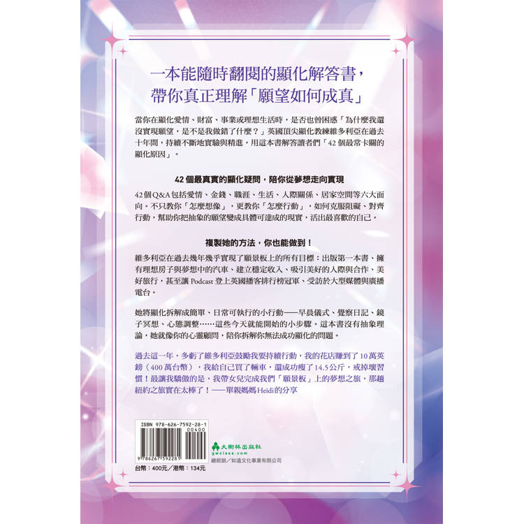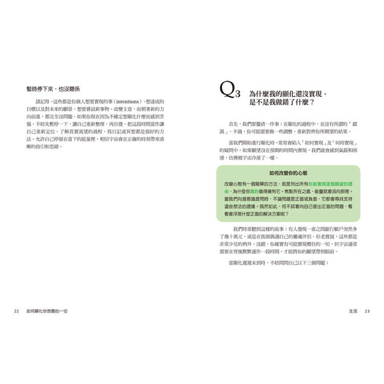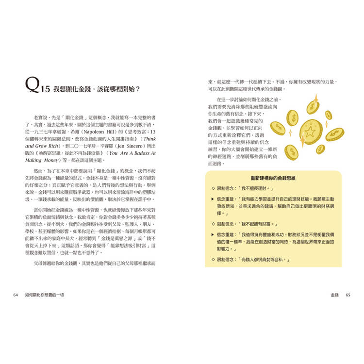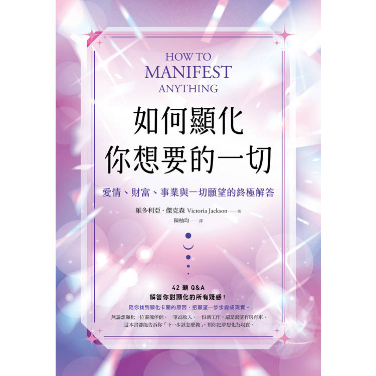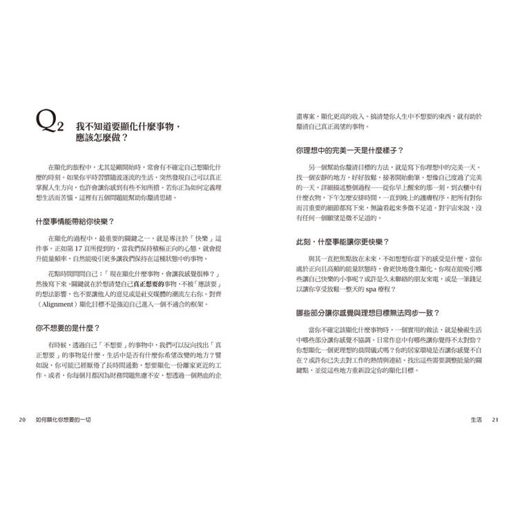 這本書由英國顯化教練維多利亞整理讀者最常見的顯化疑問,將全書分成六大方向:生活、愛情、金錢、職涯、家人與朋友、居家空間,用42個Q&A 的方式讓你像翻字典一樣,直接找到「我到底卡在哪」,知道下一步怎麼做。例如: