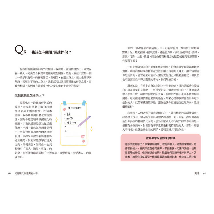 在接下來的六個章節中,我們將會探討顯化應用在人生、愛情、金錢、職涯、友誼與親情,以及居家空間等領域的概念。你會看到一系列精心設計的問答,幫助你從容面對人生的不同階段。或許,你會選擇從頭到尾細讀這本書,逐頁翻閱,當某些內容特別吸引你時,也可以在那一頁摺書角,方便日後回顧。或者,你也可以直接跳到吸引你注意的某個章節,因為它正好回答了你長久以來尋找的問題。不論你選擇哪條閱讀路徑,都請相信宇宙會引領你找到最需要的那一頁。