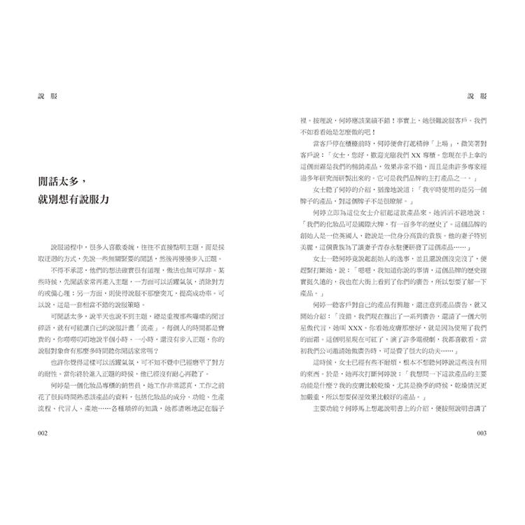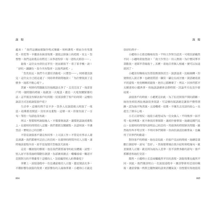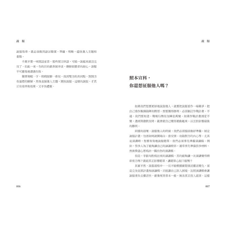 說服別人,是交流與合作的利器,用話語勸說對方聽從自已的意見,用理由充分的說辭使對方心服口服,已經成為我們的職場必修課,也是我們人生的基本功。這本書告訴大家,當我們與別人意見相左時,想要讓對方認同我們的想法、達到我們想要的結果,並不是一件容易的事情,只有了解對方在想什麼、想要的是什麼,你才能夠運用技巧去說服別人。